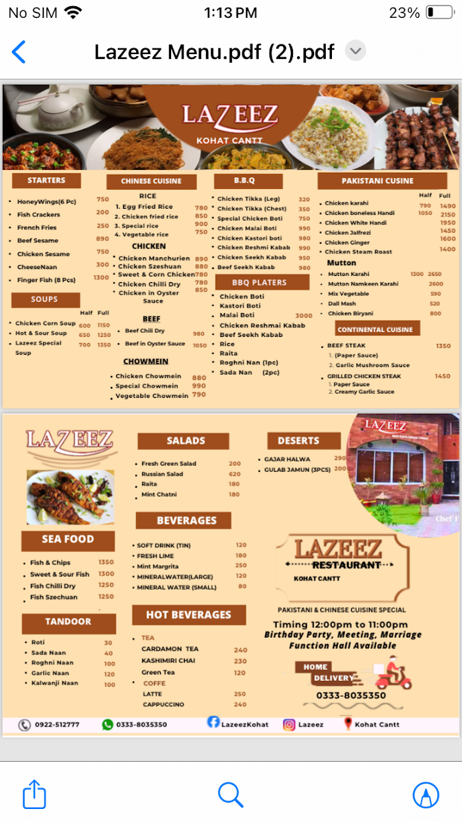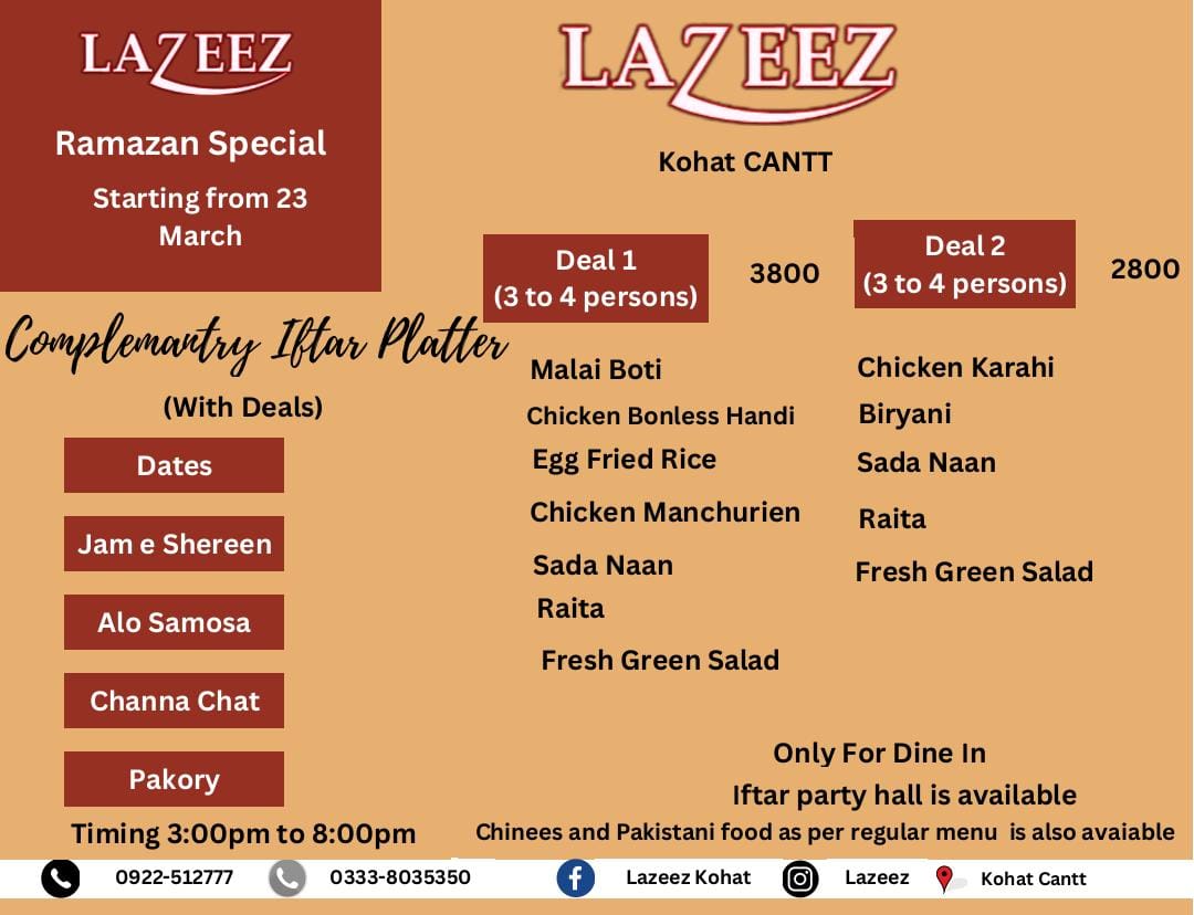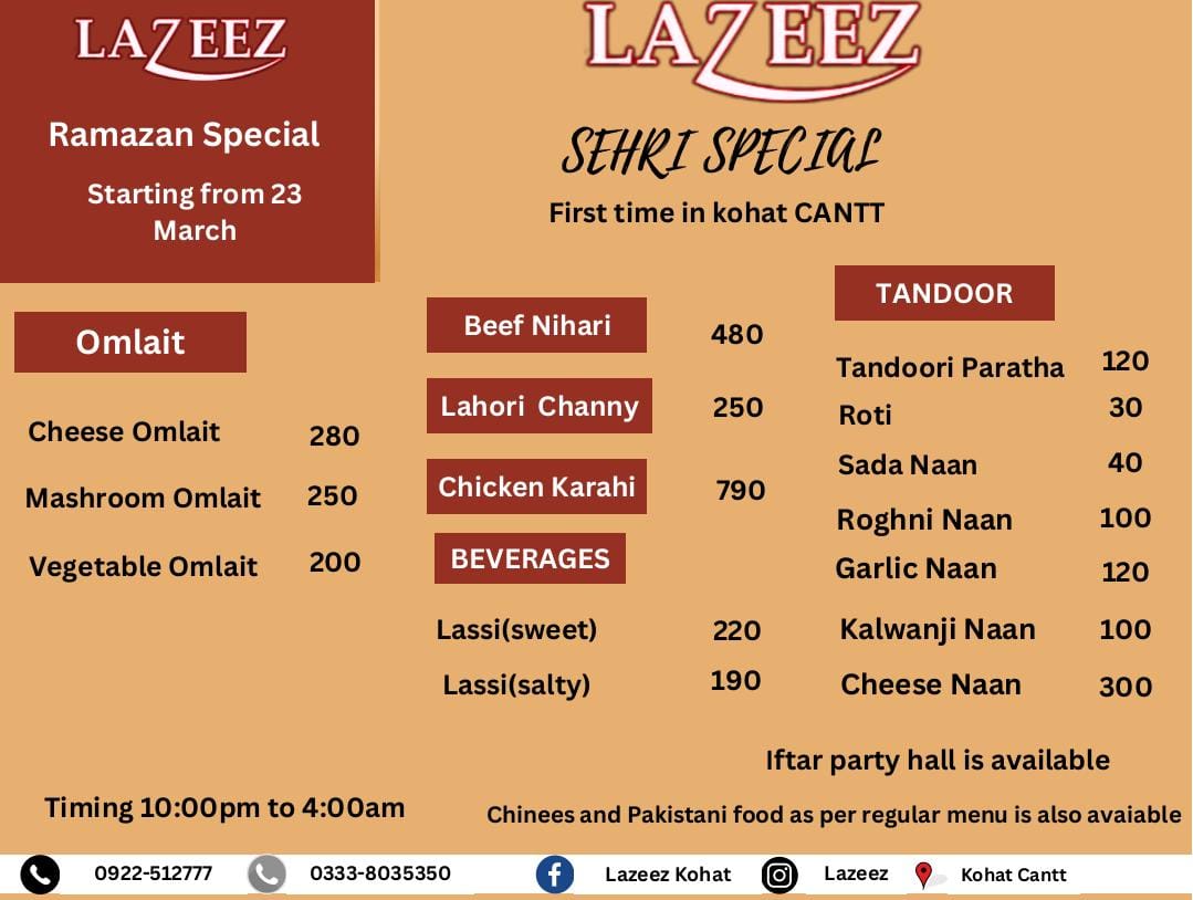 LAZEEZ - Kohat Cantonment Kohat is a notable dining destination located near Samana Bakers in Kohat. Renowned for its exceptional desi cuisine, this restaurant has garnered praise for its elegant ambiance and quality offerings. While their traditional dishes shine, such as the highly recommended soups and generous platters, caution is advised when venturing into Western options, as some may fall short of expectation. Customer reviews highlight a mixed bag, with some expressing disappointment in specific items like the Russian Salad. Overall, LAZEEZ provides a satisfying experience for food enthusiasts in the cantonment area, making it a worthwhile visit.